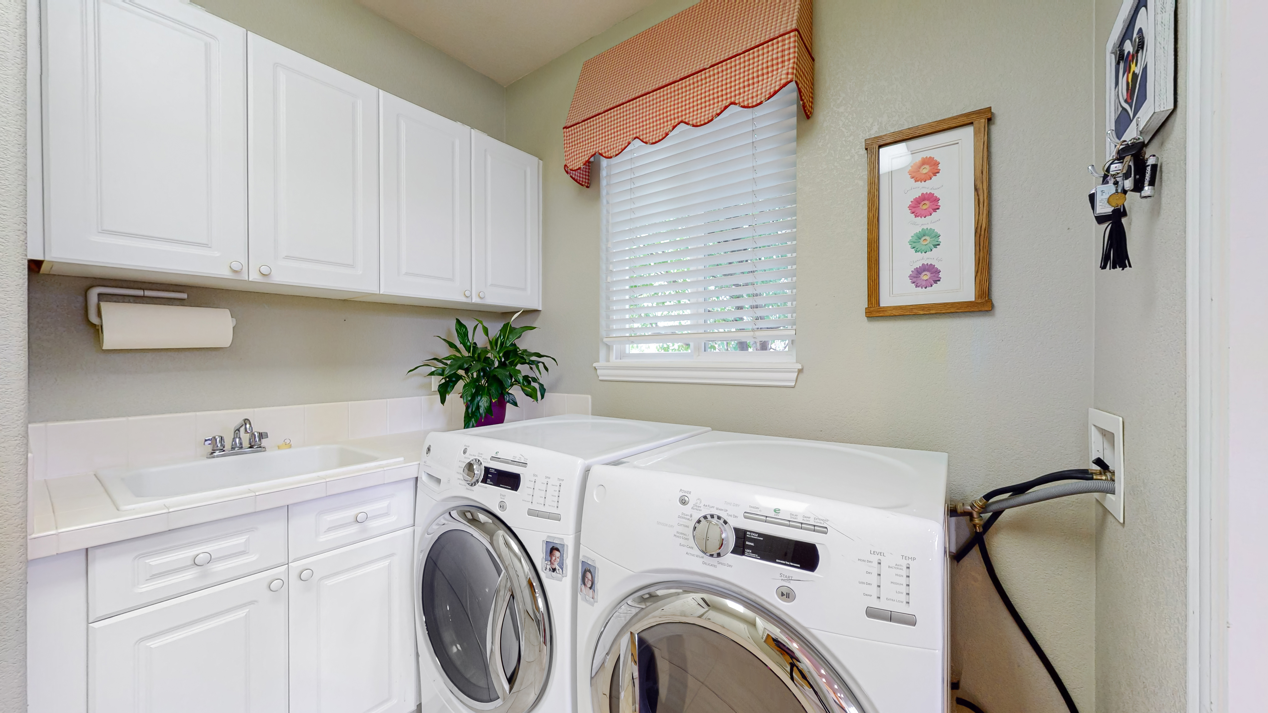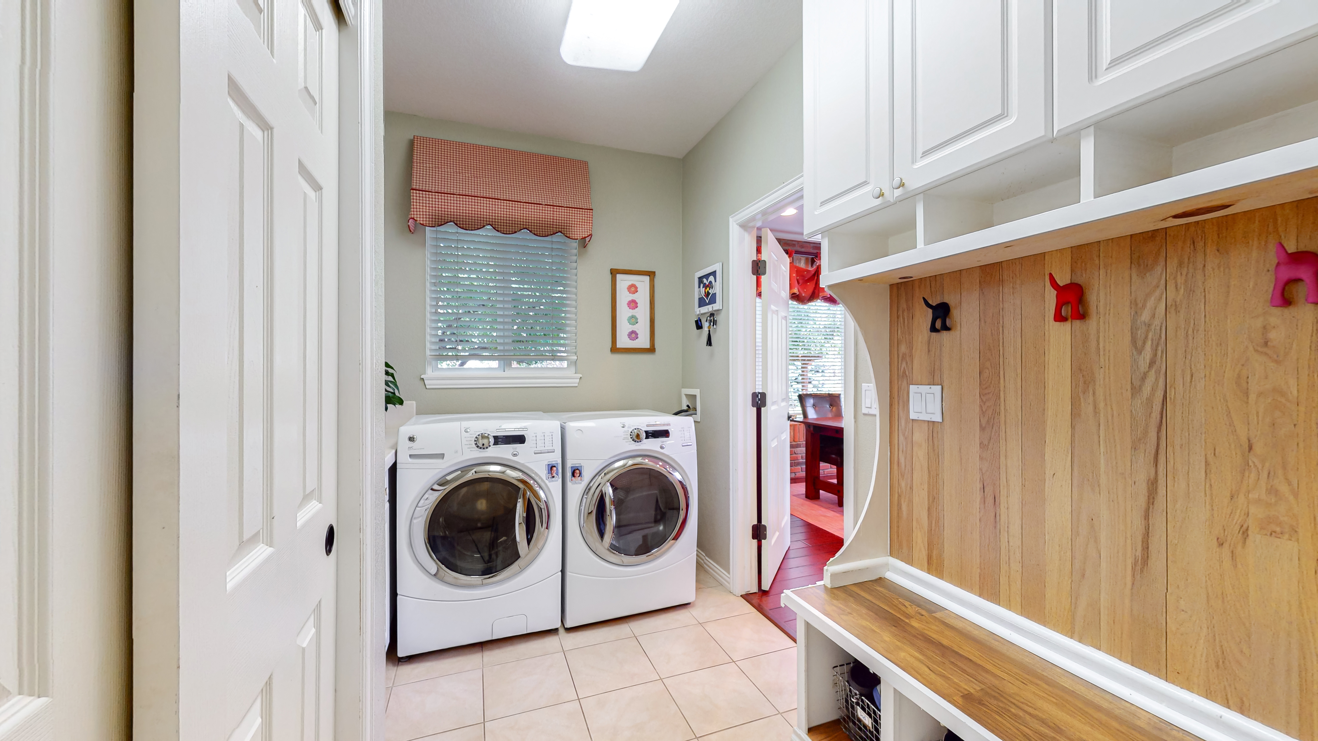 The laundry room connects directly to a built-in mudroom with bench, wood-paneled back wall, and upper cabinets. Good bones โ needs a style update to match the rest of the house.