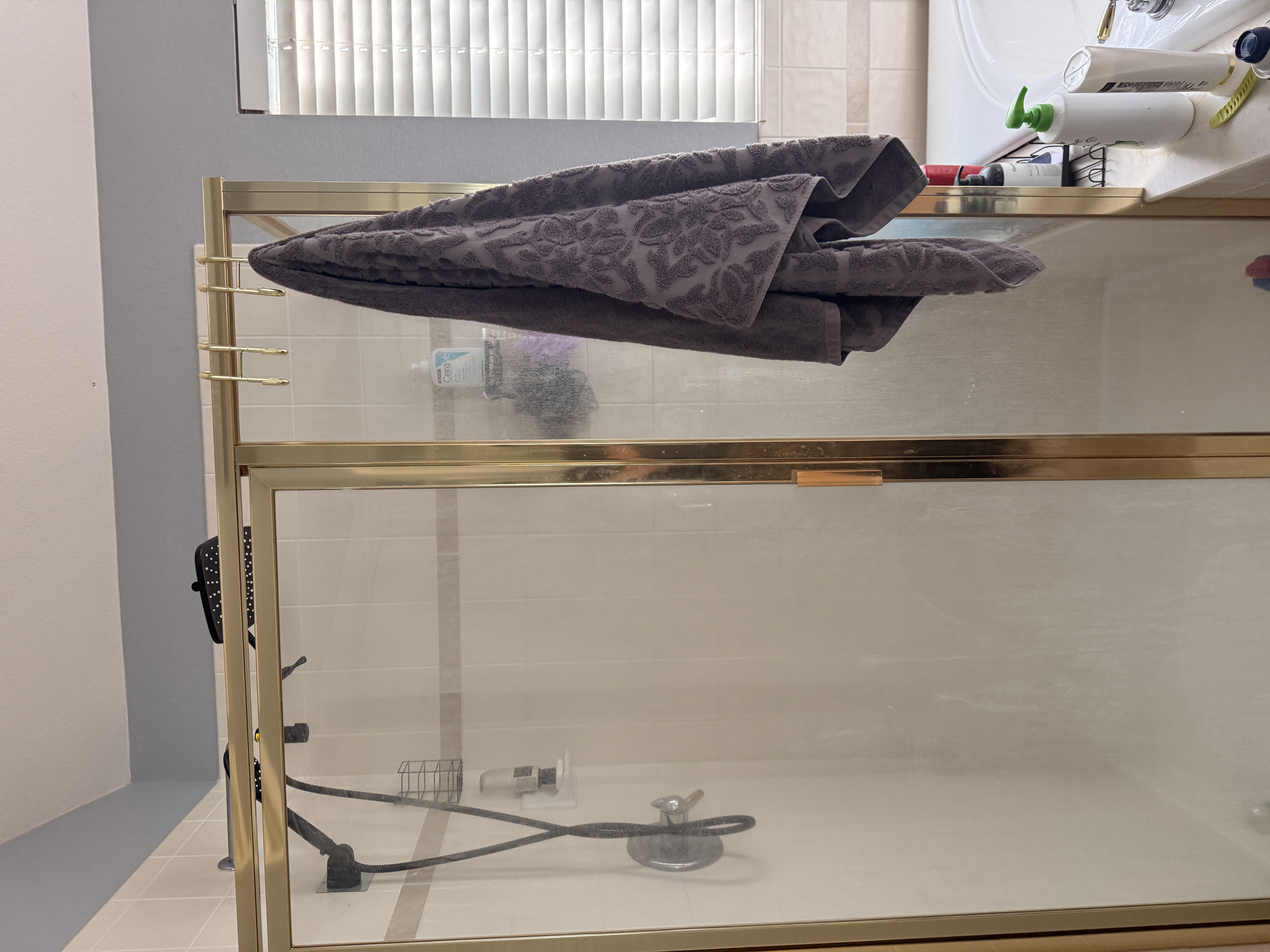 The gold/brass shower enclosure frame is a huge visual element and sets the dated tone of the entire bathroom. You can refinish it in place: tape off the glass and tile, scuff the brass lightly with fine sandpaper, apply a metal primer, then 2-3 light coats of matte black spray paint. Half a Saturday.