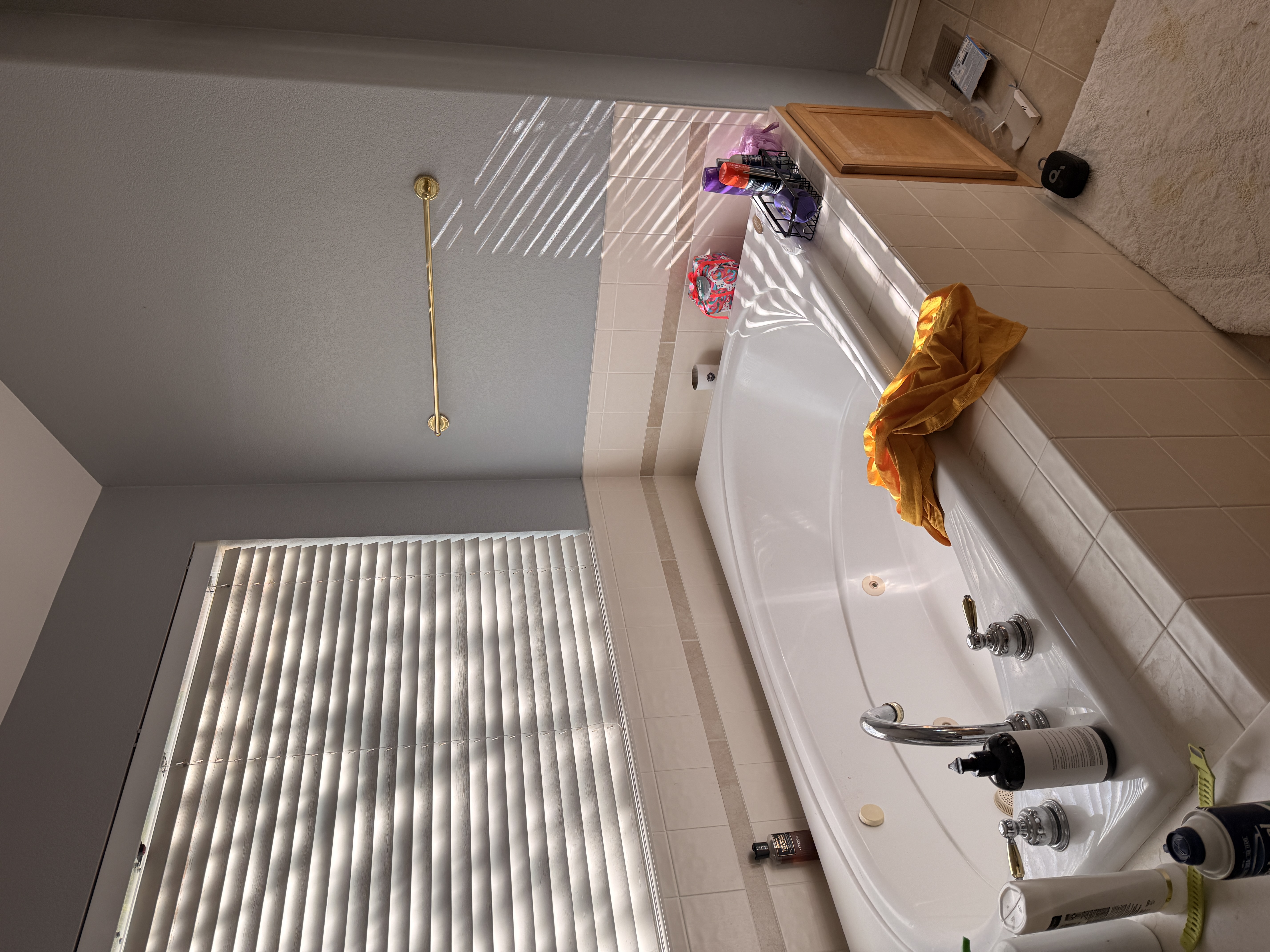 Current state: late-90s/early-2000s builder bath with honey maple cabinets, tile countertops with grout lines, gold/brass shower enclosure frame, and a gold pendant over the tub. The automated blinds are custom from the builder โ they stay. Goal: transform the room without a full gut reno.