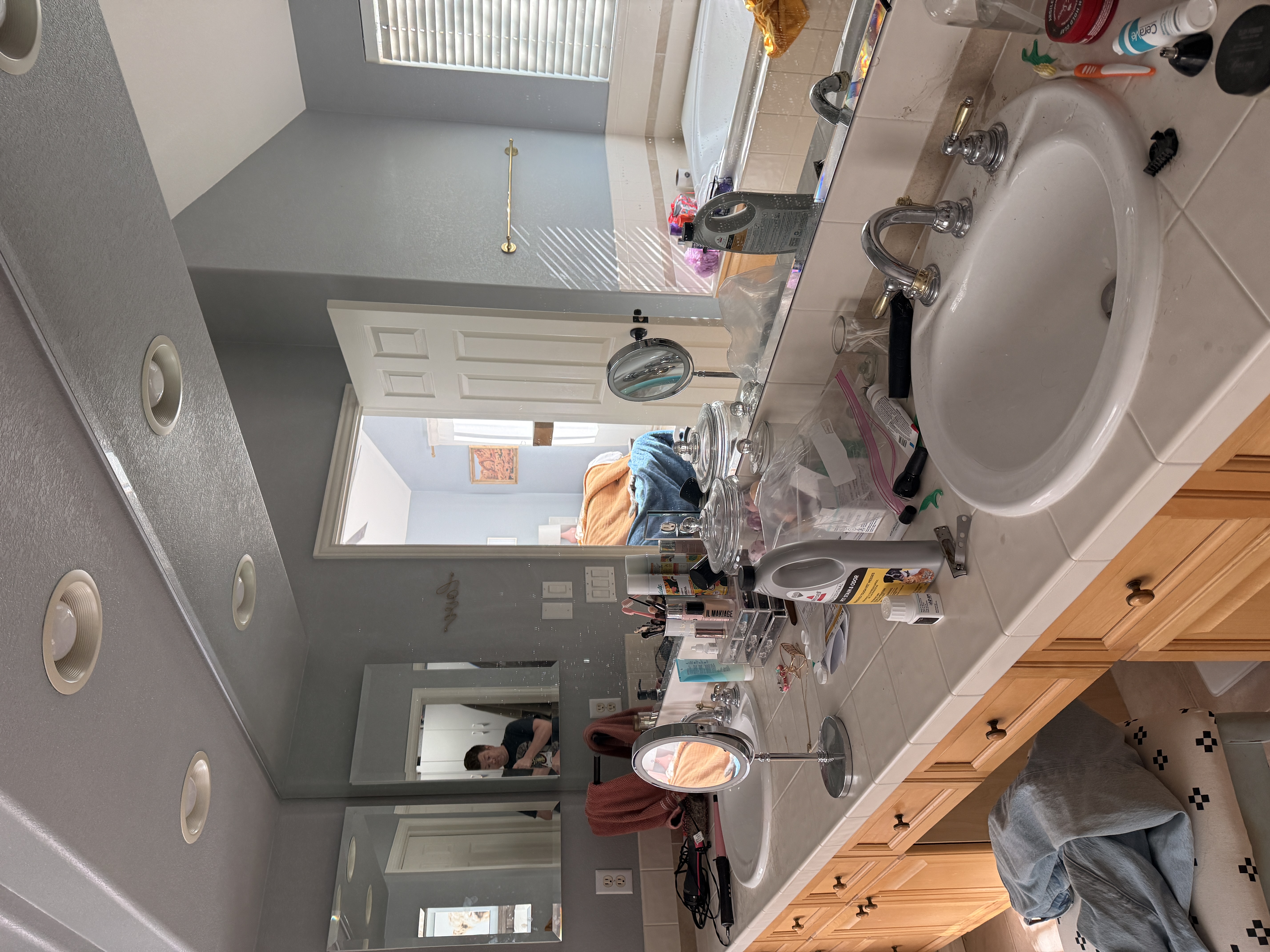 The maple cabinets dominate the vanity wall and are the single most dated element in the room. Painting them warm white, sage, or a deep color completely transforms the space. Modern cabinet paint kits require no priming or sanding โ roll on, let dry, done in a weekend.